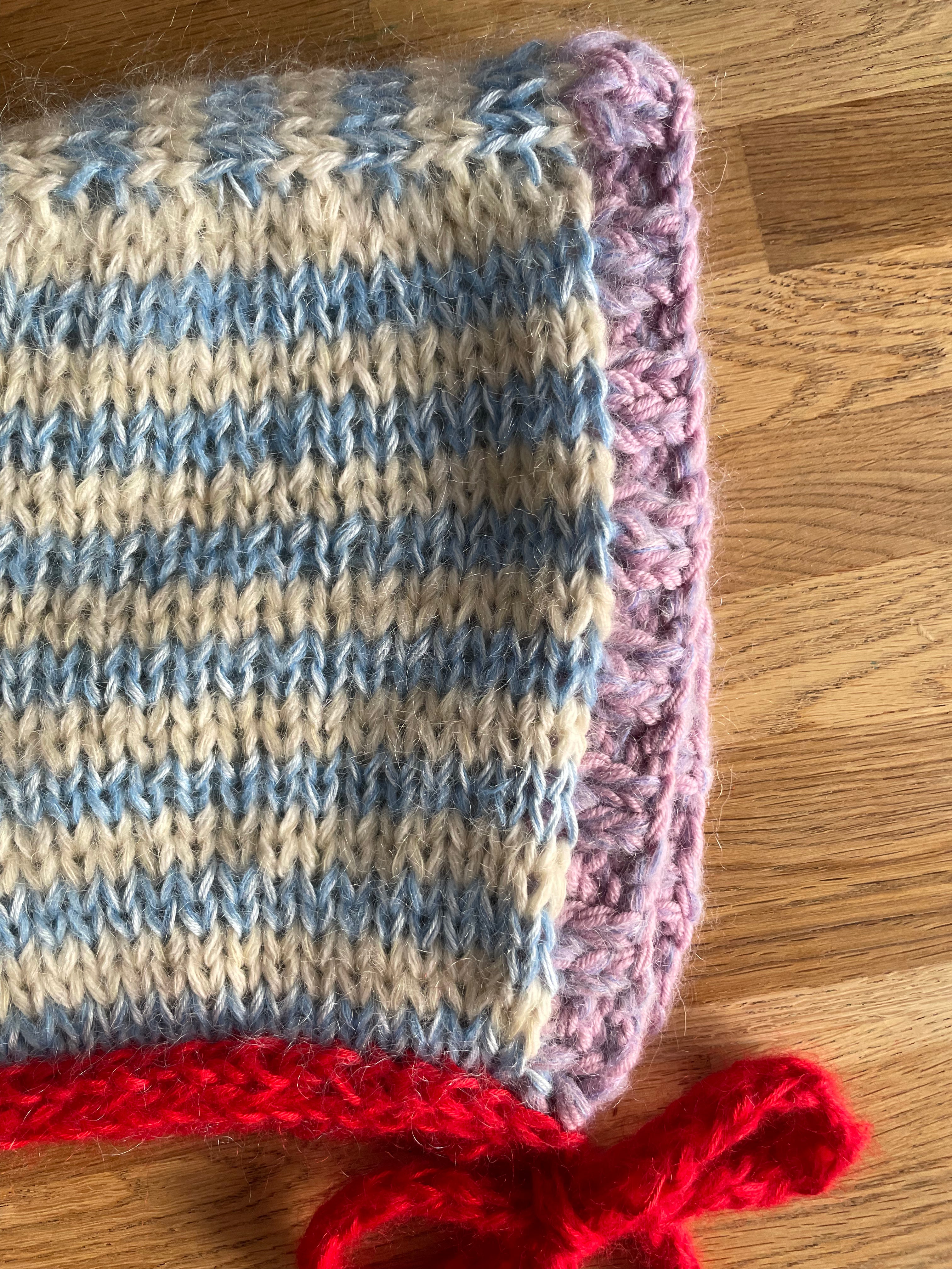 Realizzato interamente a mano in filato lana merino e superkid mohair lavorati assieme, il corpo lavorato a righe e le rifiniture di un altro colore a contrasto.