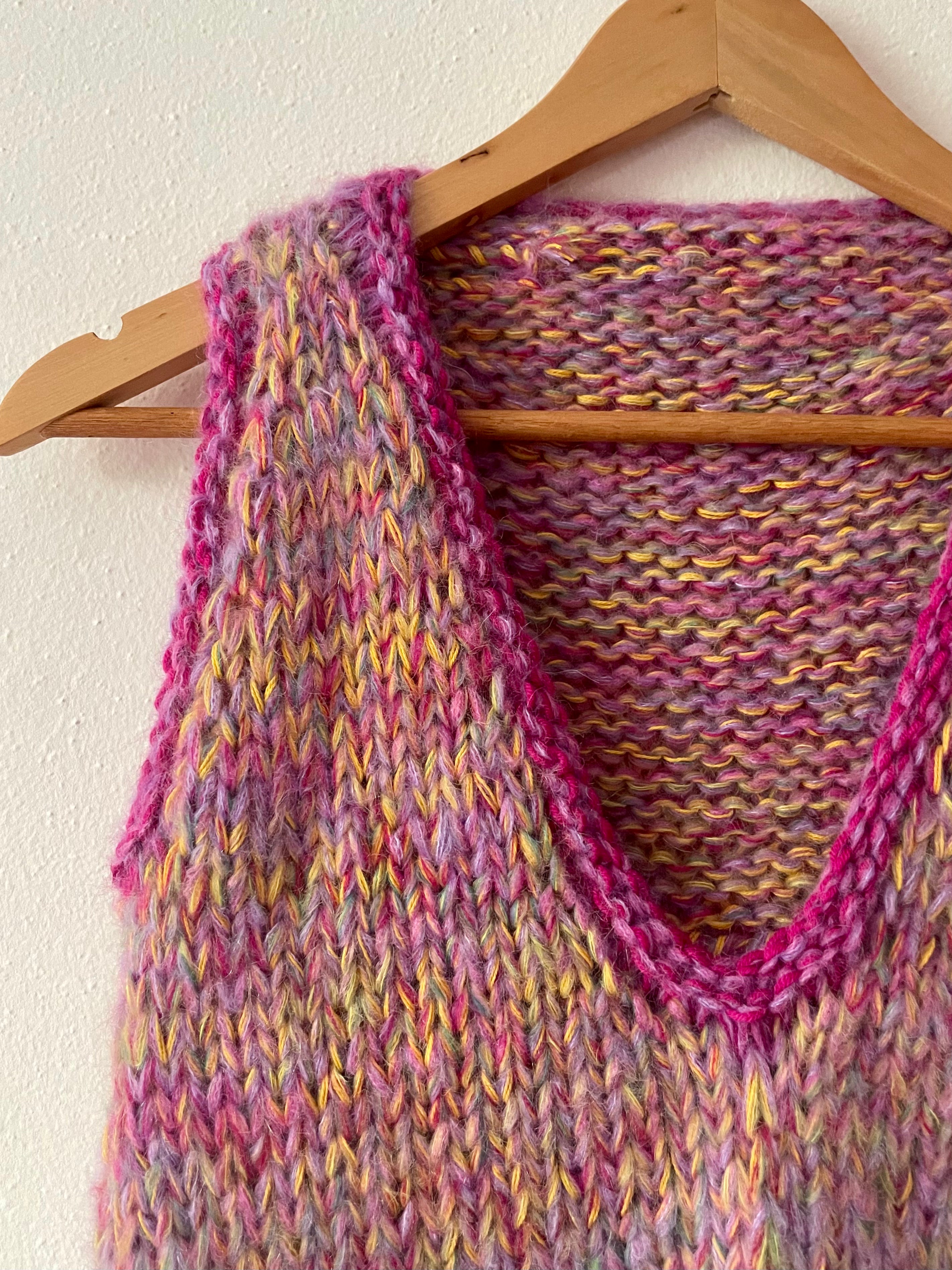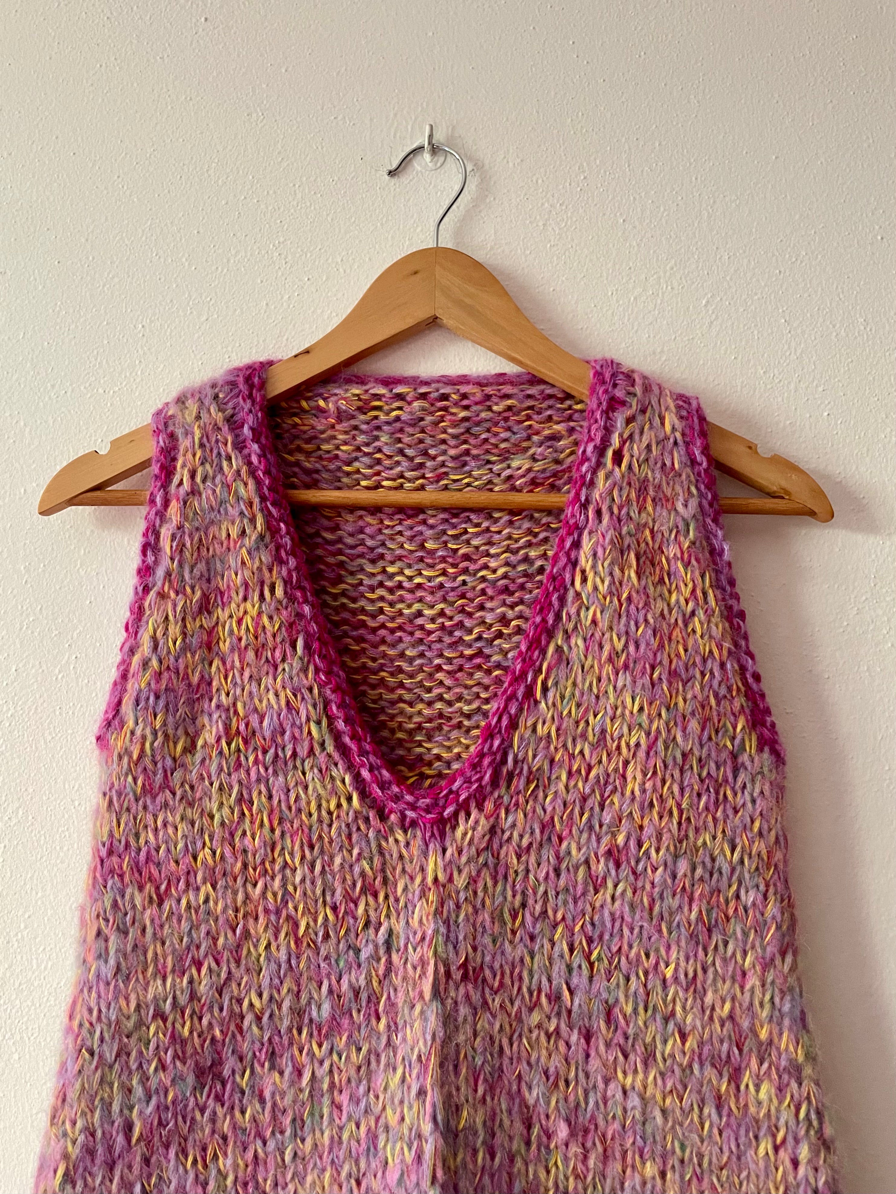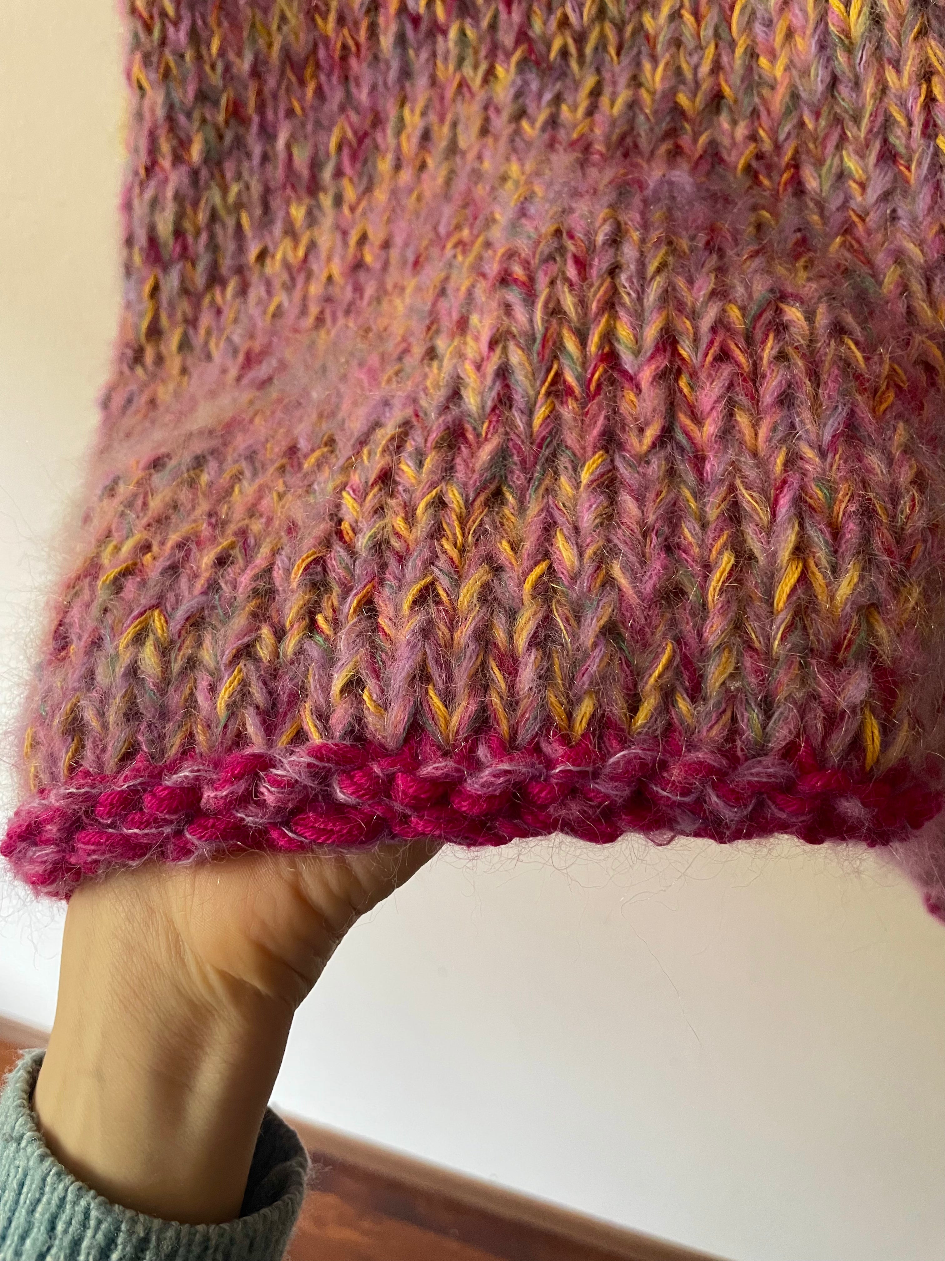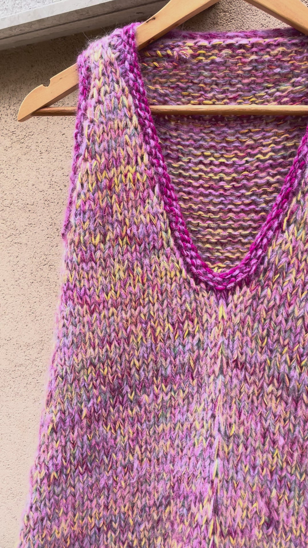 Vestito realizzato interamente a mano a maglia. La base di questo abito svasato è un filato di lana merino giallo, a cui sono stati aggiunti diversi filati di superkid mohair (lilla, fucsia, verde acqua e giallo) a formare questo colore melange/sfumato davvero luminoso e particolare. Come sempre si tratta di rocche di filato di fine produzione delle migliori filature italiane, per un capo realizzato in modo sostenibile.