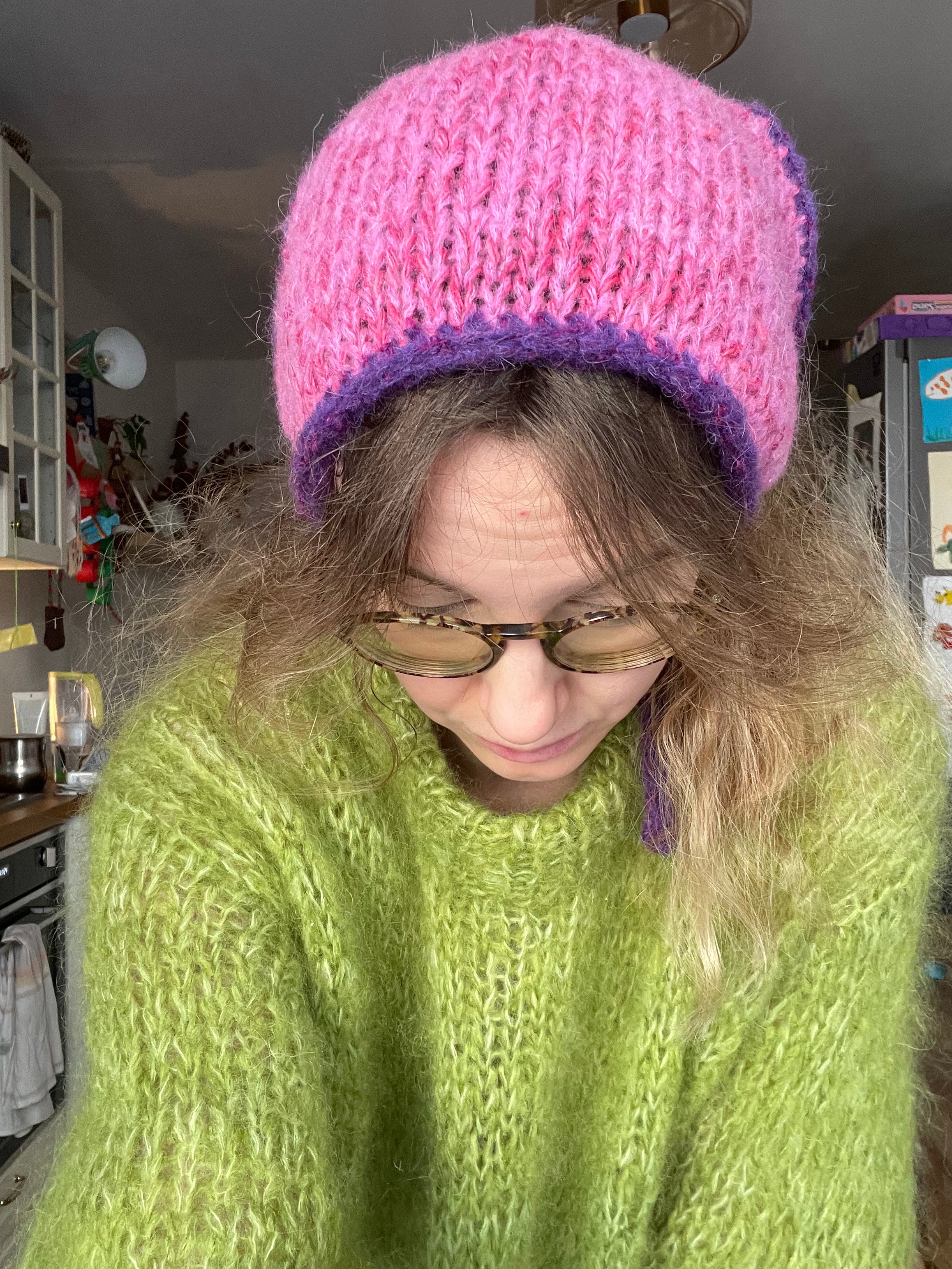 Morbida e calda, realizzata a maglia rasata e orlo a contrasto realizzato con tecnica I-Cord.