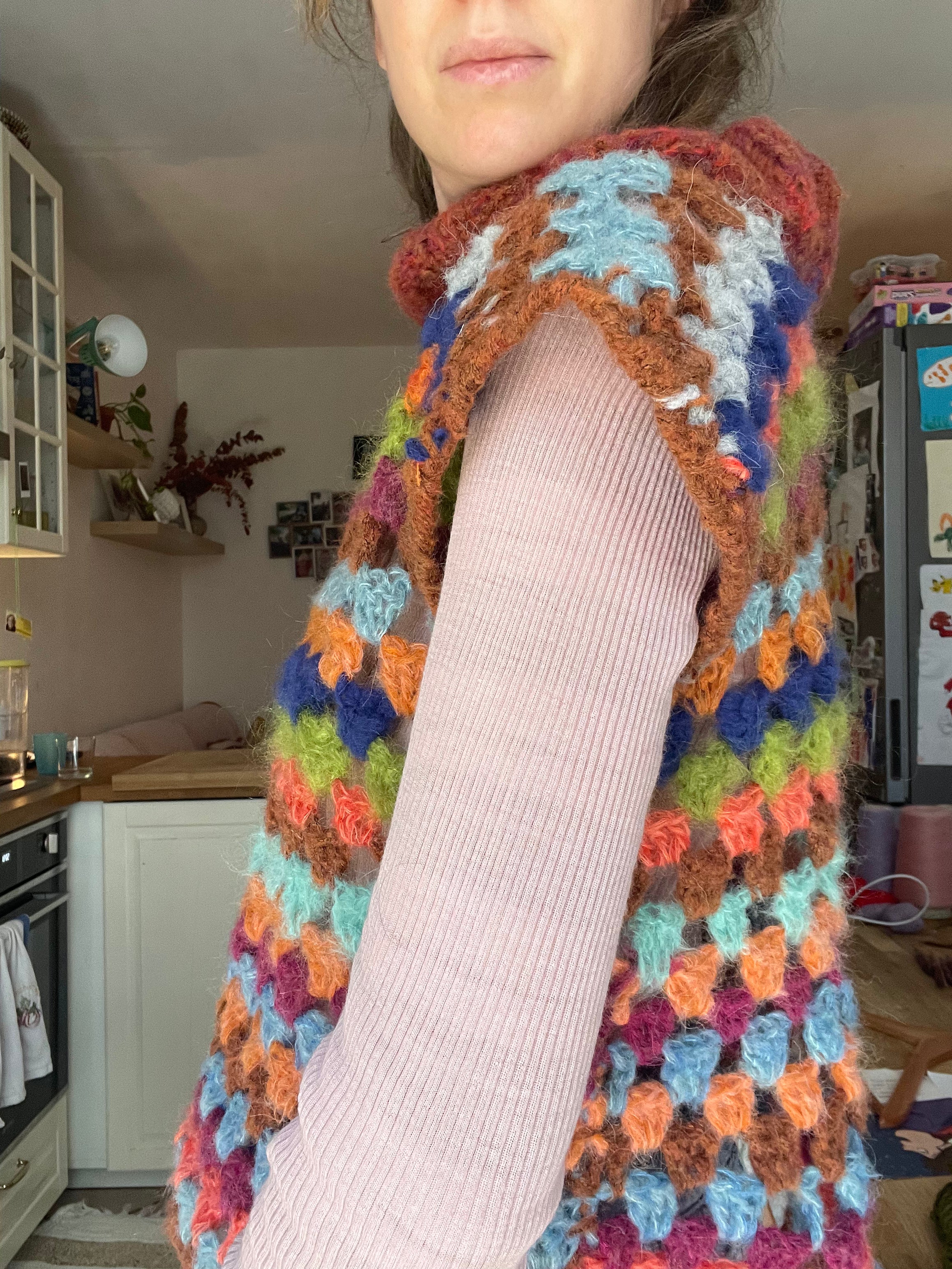 Sunny Gilet: il tuo nuovo alleato per un layering che non passa inosservato. Realizzato interamente a mano all'uncinetto, questo gilet combina lana vergine alpaca e mohair in una tavolozza di colori vivaci che cattura lo sguardo.