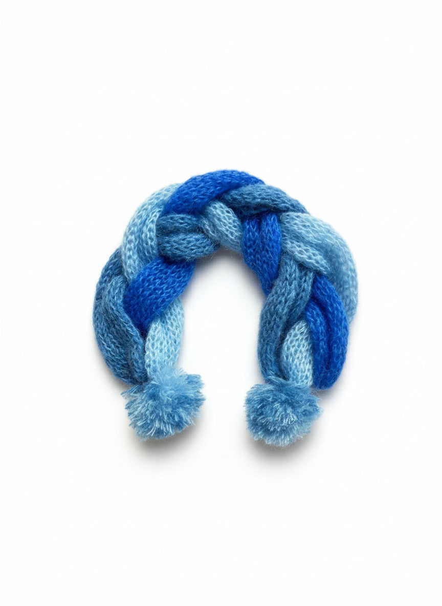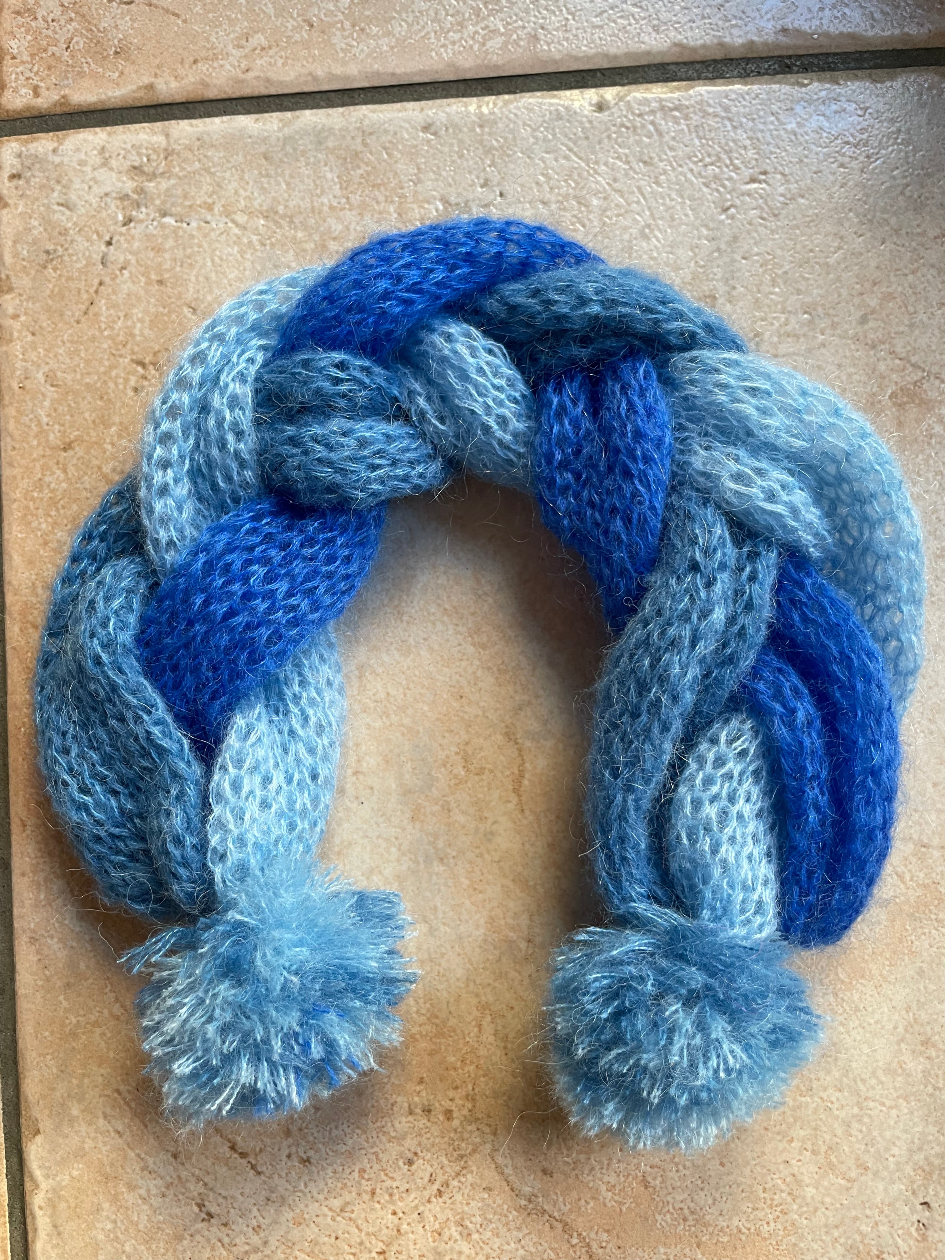 Realizzata interamente a mano a maglia, composta da tre sciarpine di colori complementari intrecciate tra loro e un dolce pon pon alle estremità. Può essere indossata da adulti ma è perfetta anche per i bimbi. Divertente e coloratissima, un accessorio unico, morbido e caldissimo.