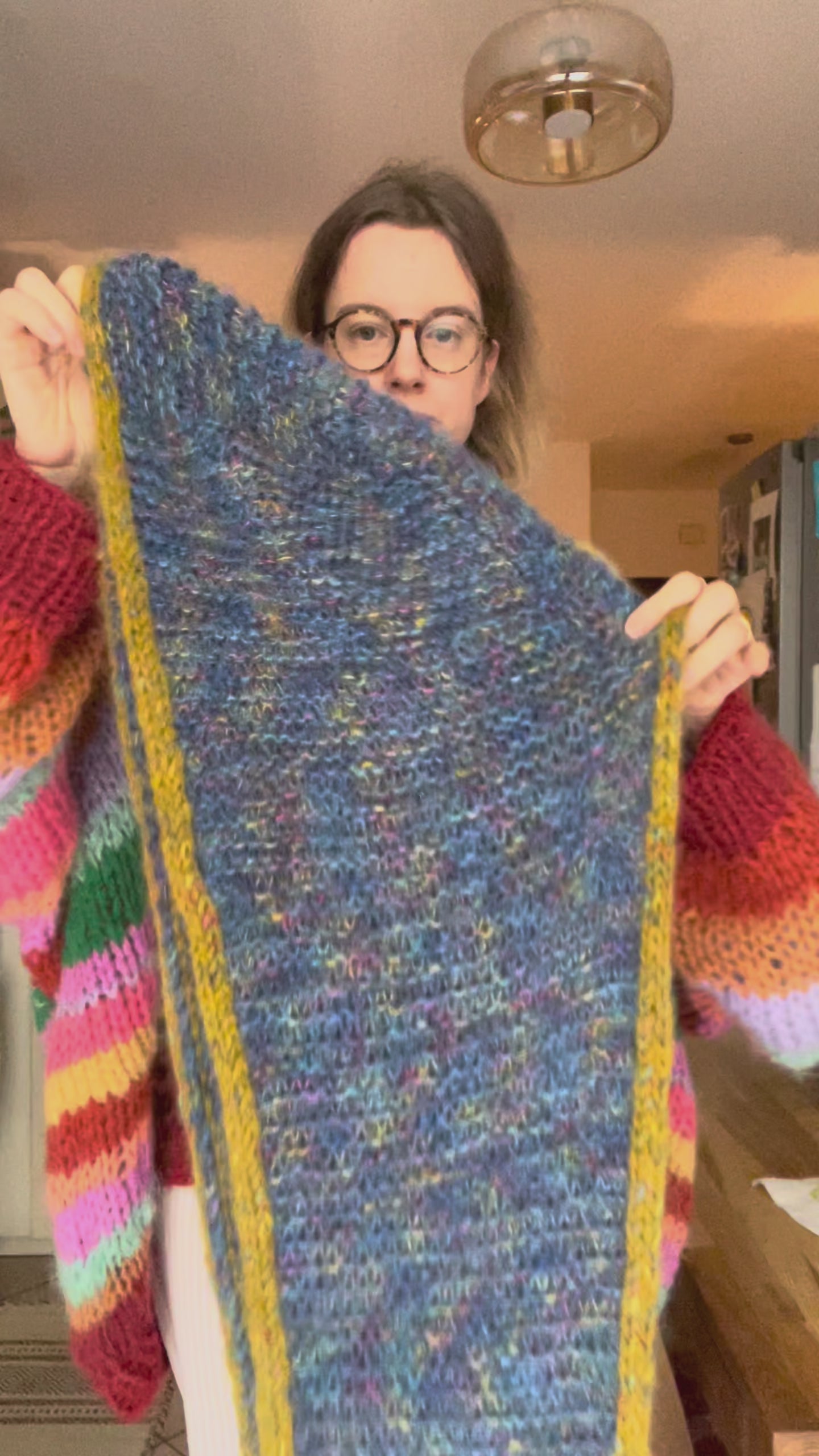 Realizzato con un filato base di lana alpaca blu lavorato assieme a quattro fili di superkid mohair e seta (blu notte, blu jeans e un bellissimo sfumato) che donano queste sfumature colorate e lo rendono unico. Tutto l’orlo è lavorato con tecnica I-Cord a contrasto.
