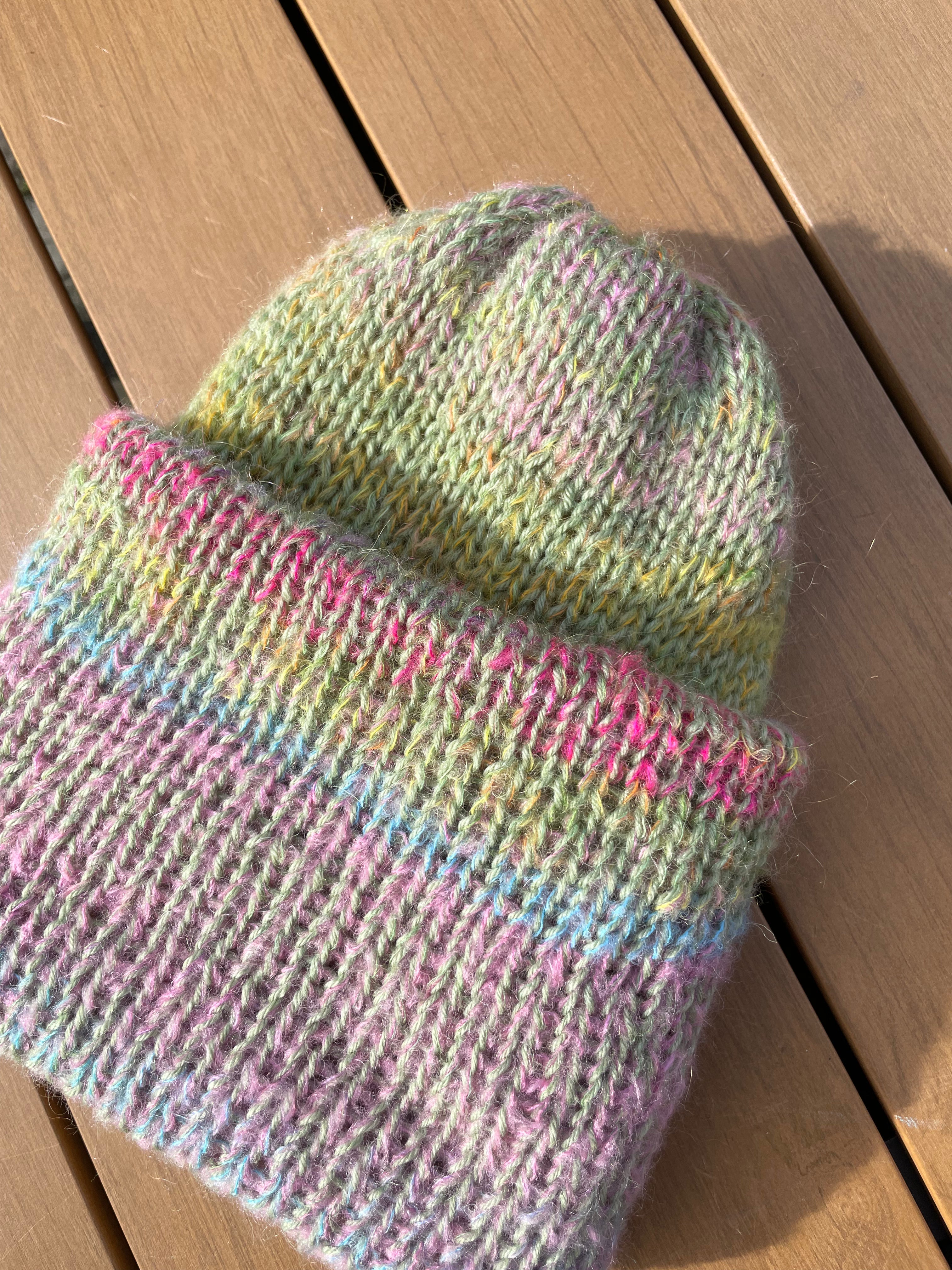 Cappellino realizzato a mano con un filo di lana alpaca verde chiaro e diversi fili di superkid mohair mélange (che creano un meraviglioso effetto sfumato lungo tutto il cappellino). Il risultato è un bellissimo colore luminoso e sfumato.
