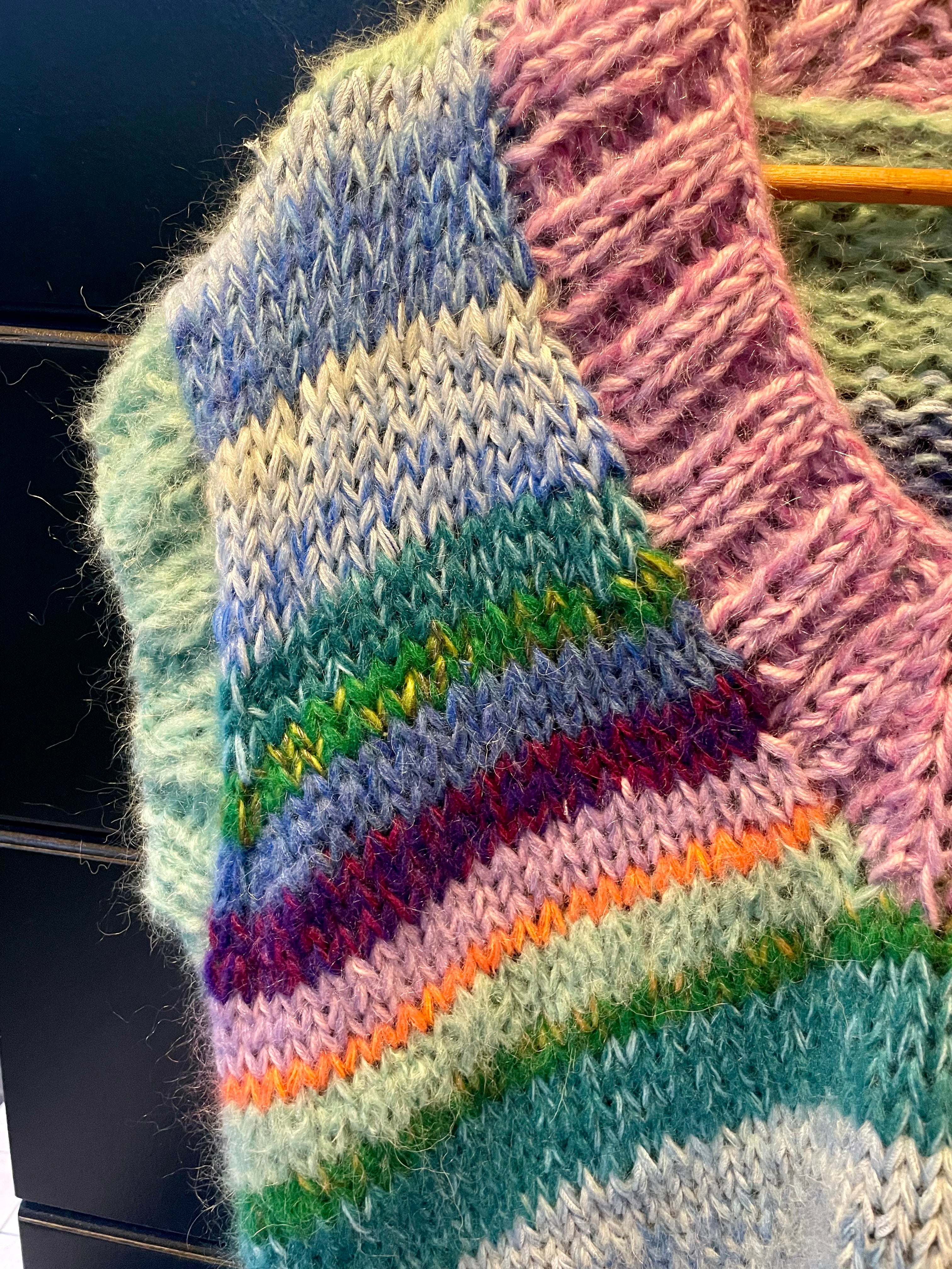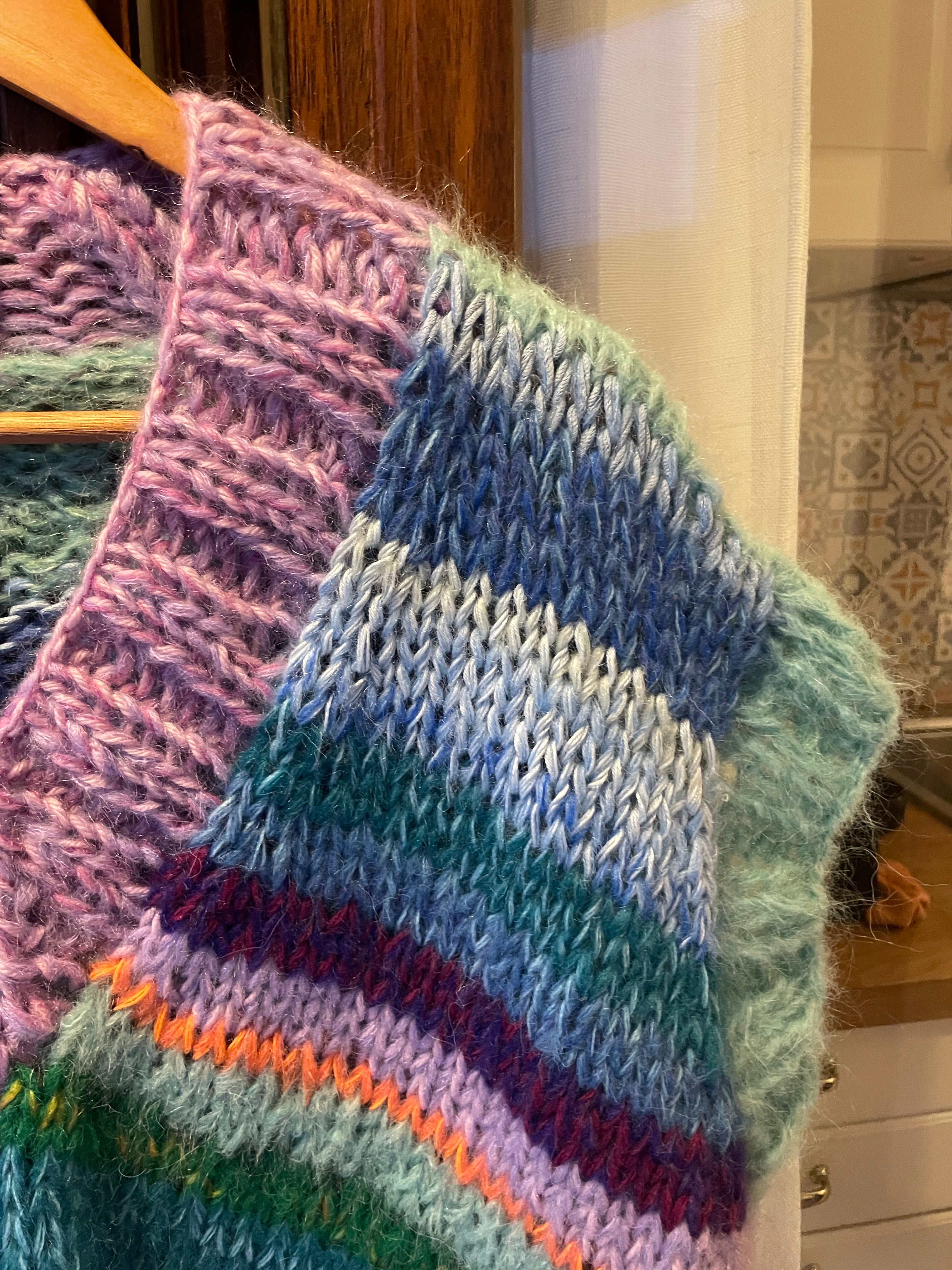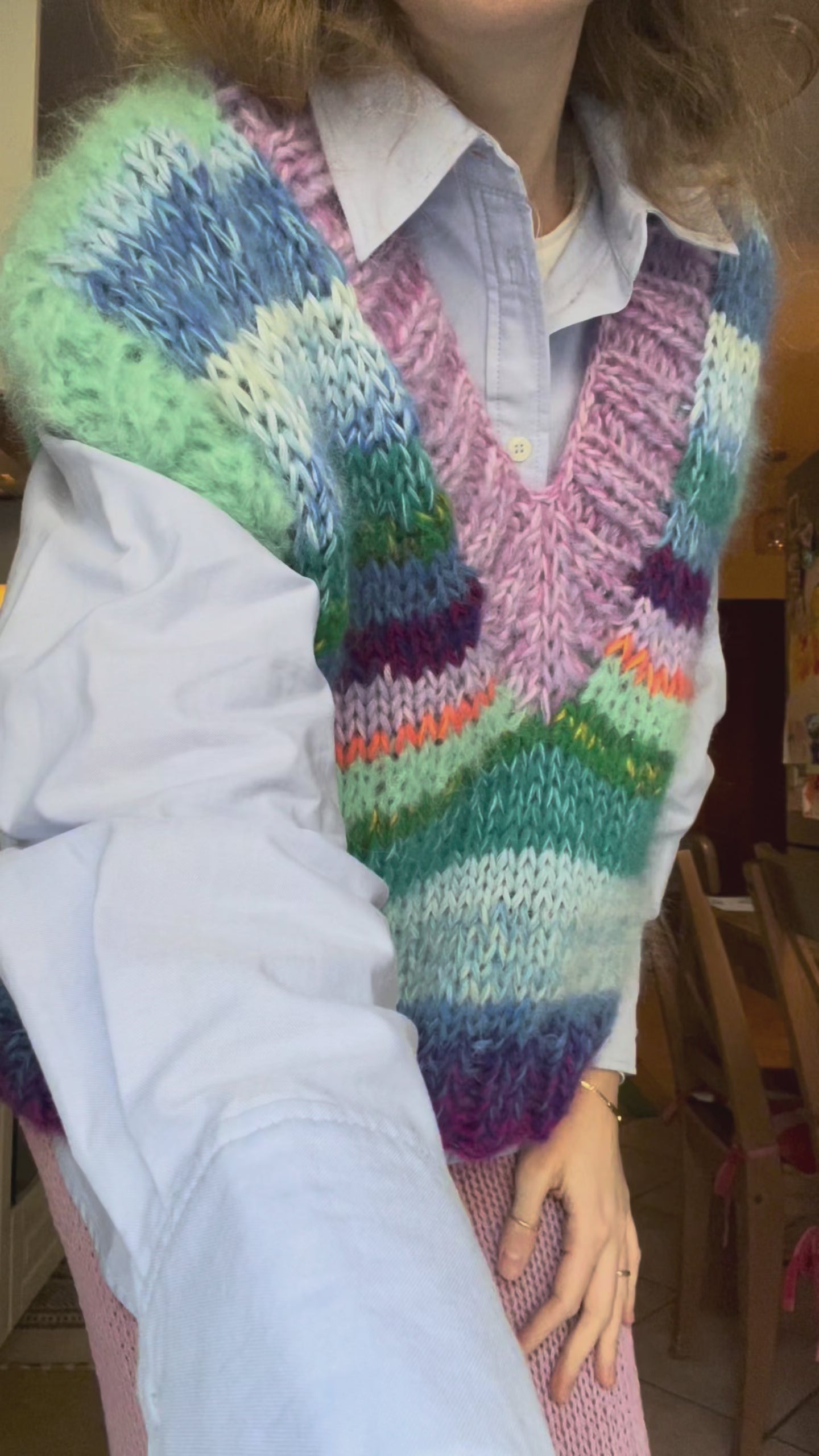 Gilet oversize dalle sfumature coloratissime e luminose, realizzato interamente a mano. Morbido come una nuvola e caldo caldo, da utilizzare tutto l'anno giocando con diversi look.