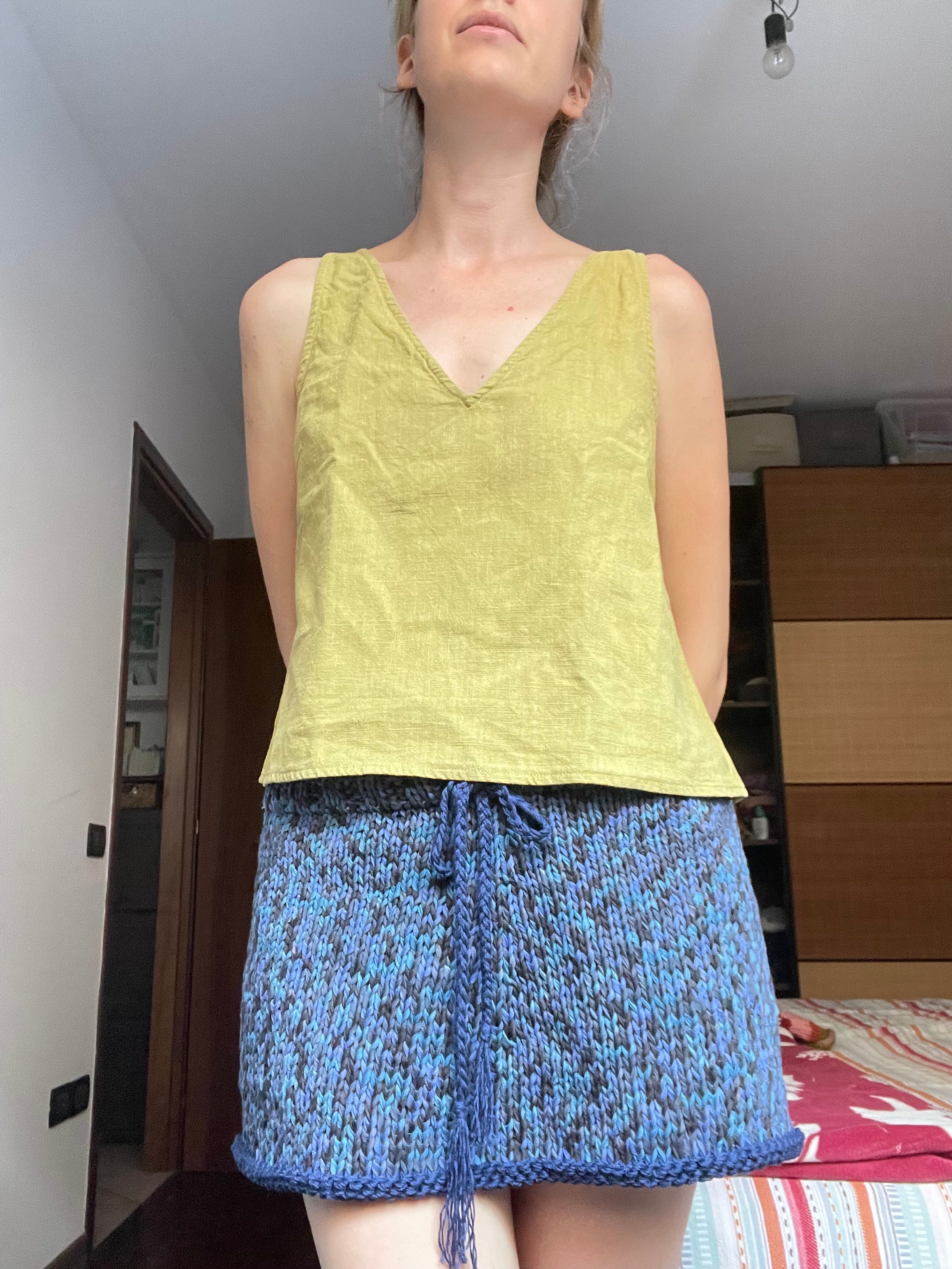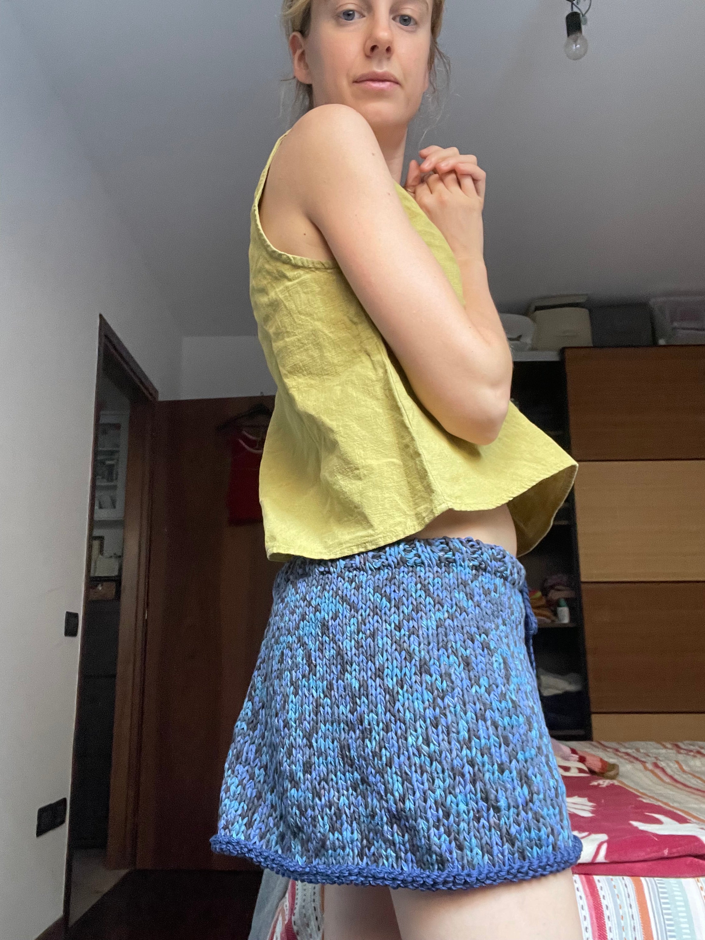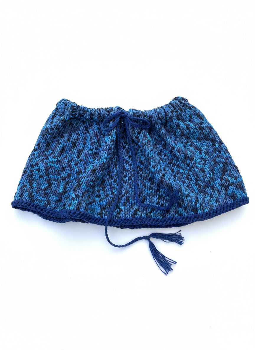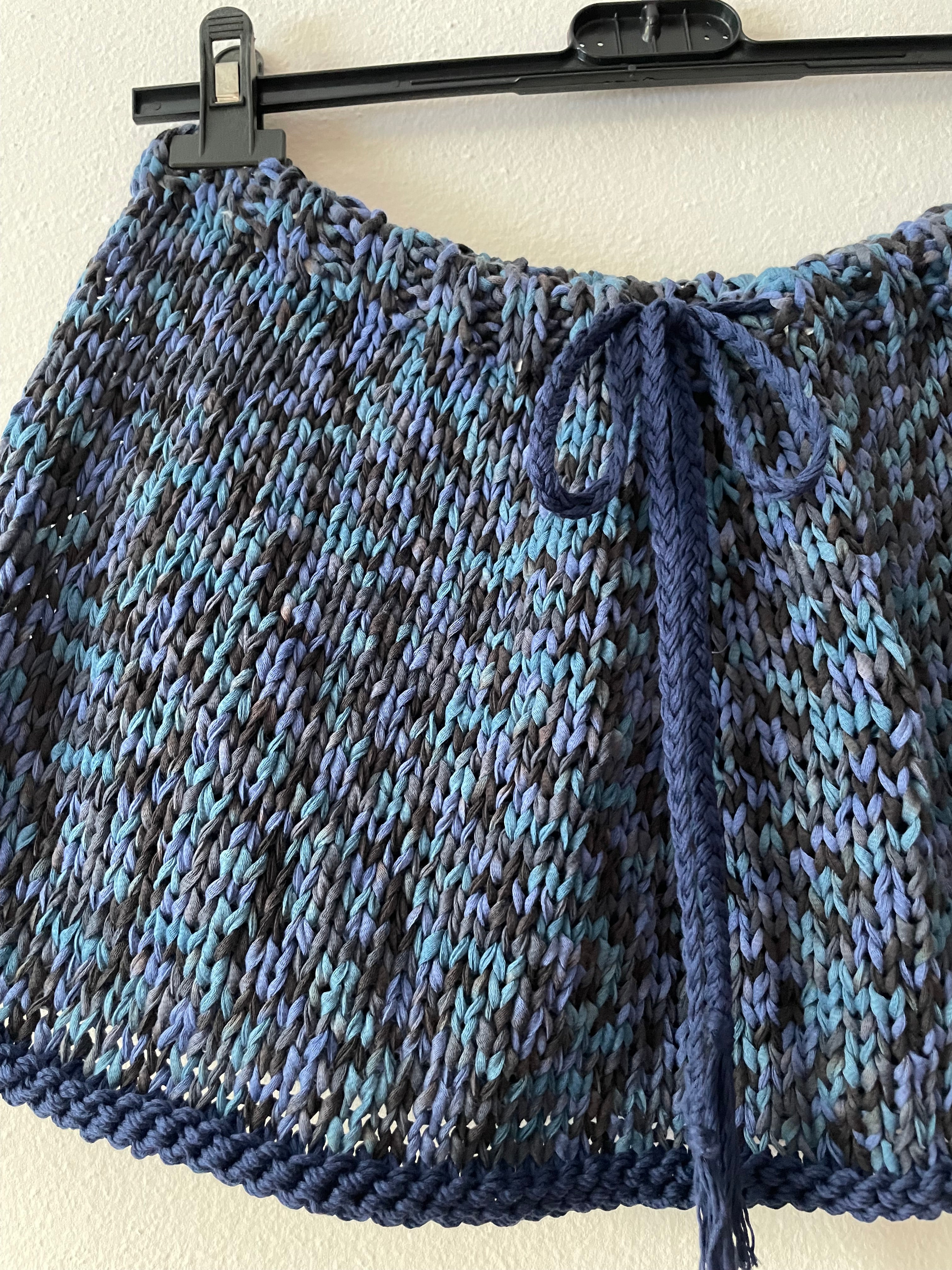 Minigonna realizzata interamente a mano in filato 100% cotone super elastico. Il colore è un bellissimo blu notte sfumato.