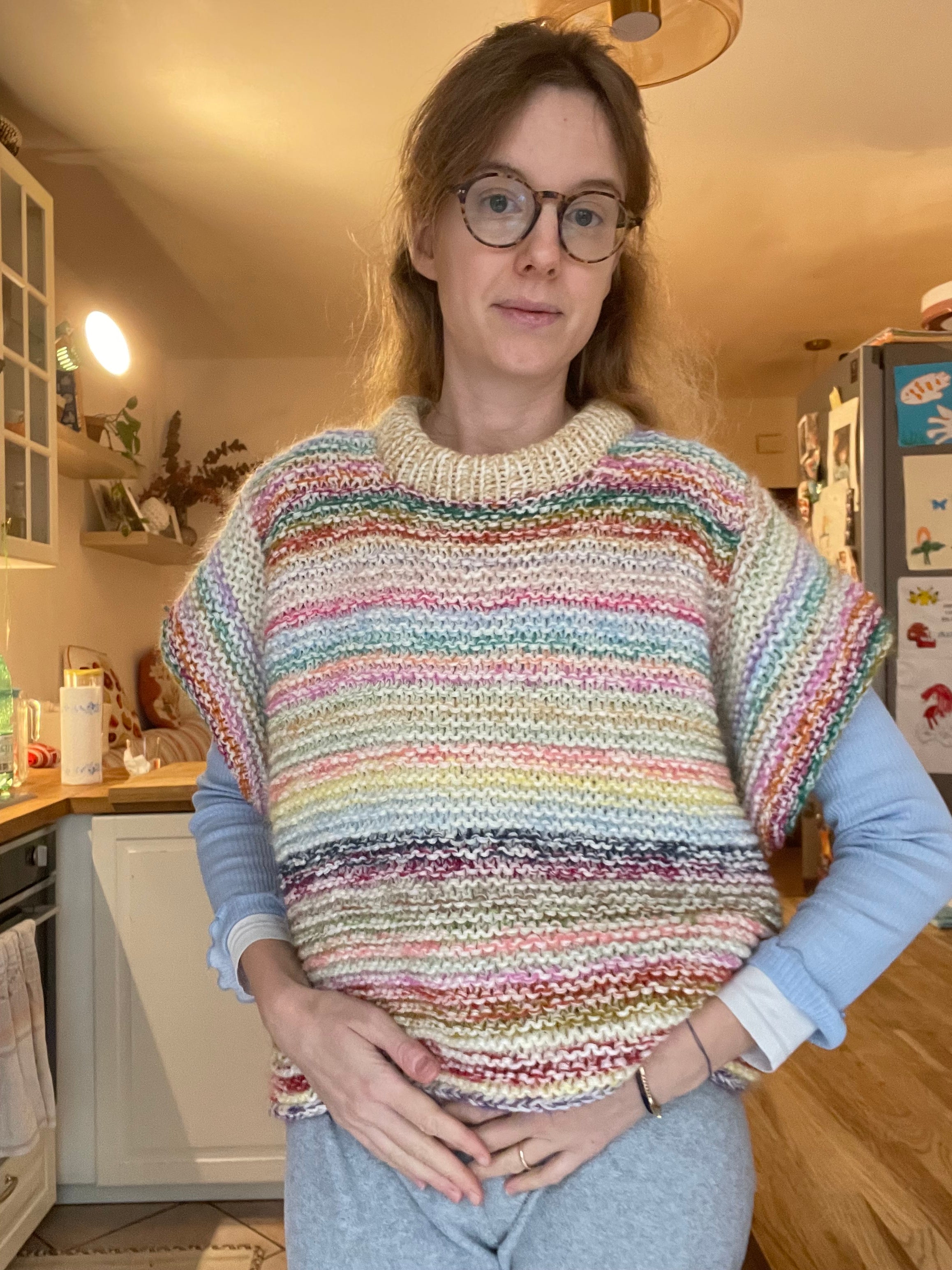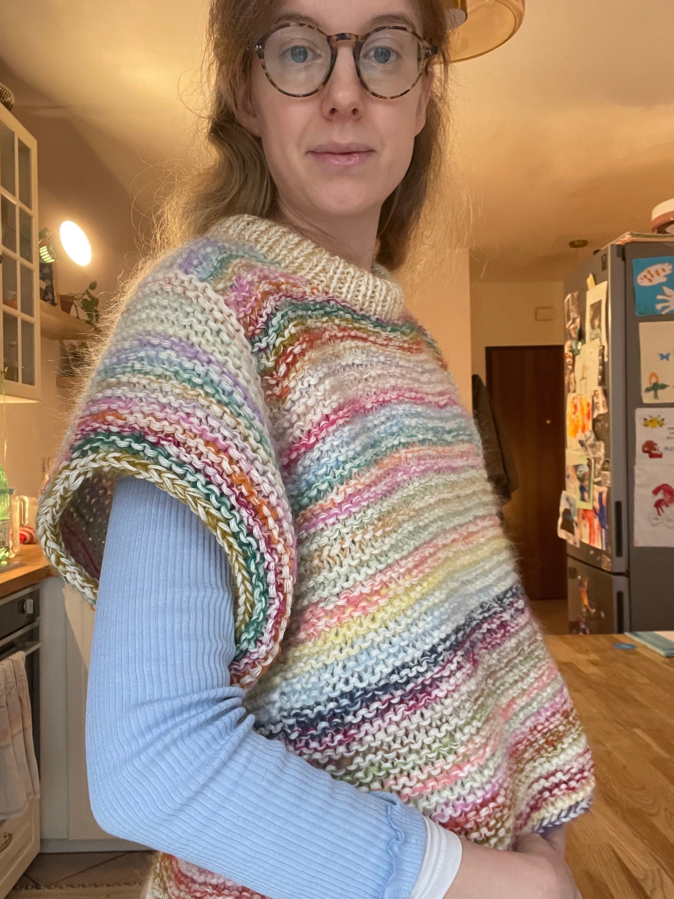Maglia invernale a maniche corte realizzata interamente a mano. Il filato utilizzato come base è un filato deadstock 80% lana merino 20% cashemere, lavorato assieme a diversi fili di superkid mohair e seta, che formano un arcobaleno di colori.